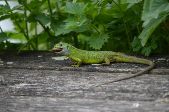 Near the lake or millpond you are likely to see fluorescent green lizards, huge green and gold frogs who make the loudest chorus noise in early summer, as well as fabulous coloured dragonflies or couleuvre snakes (harmless) which often swim across the lake.